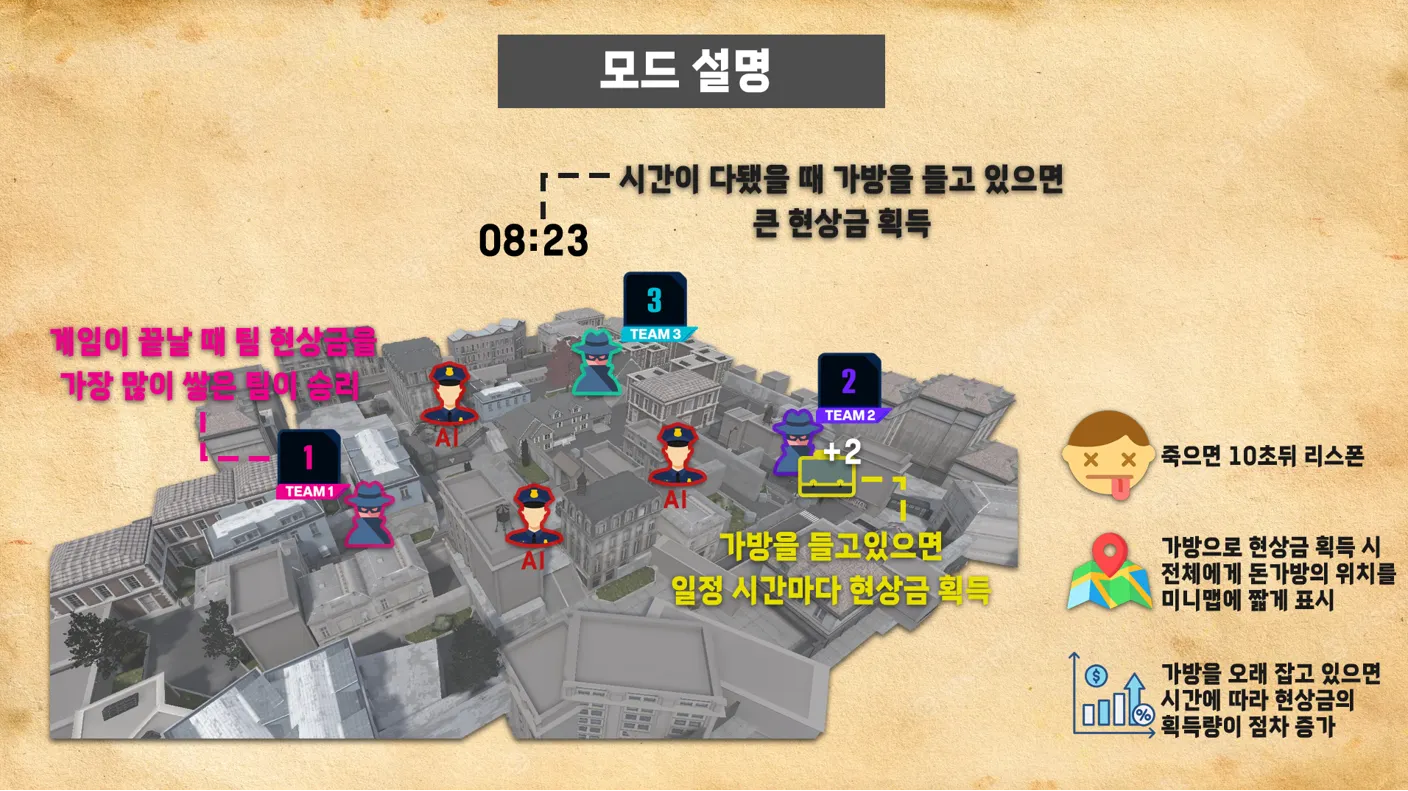 게임이 끝날 때 팀 현상금을 가장 많이 쌓은 팀이 승리