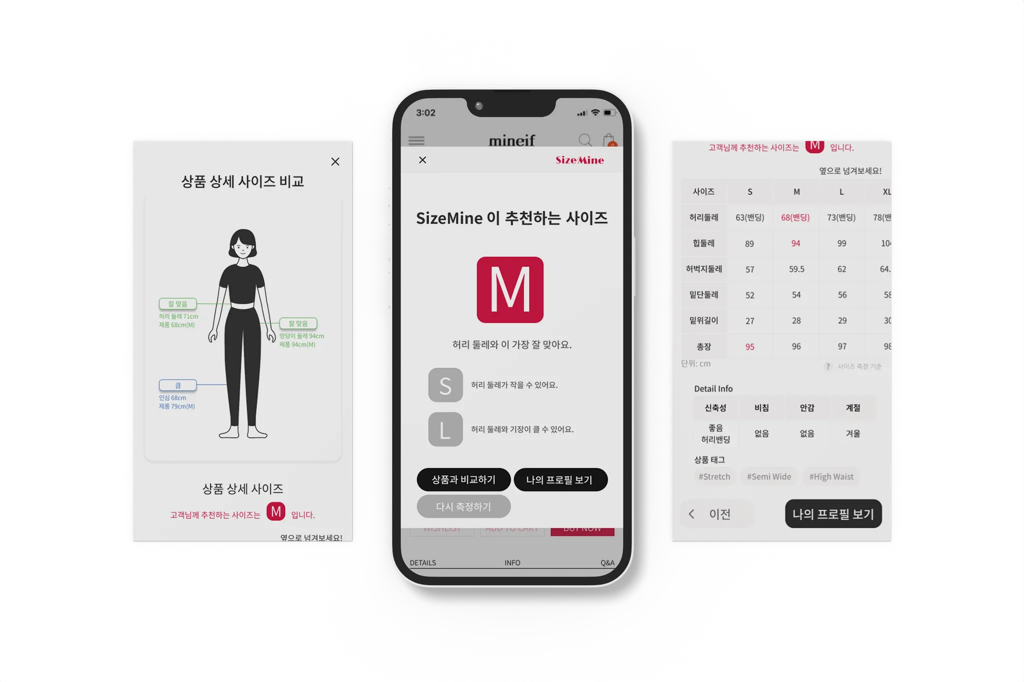 간단한 정보와 사진 한 장으로 사이즈 측정 및 추천이 가능한 SaaS 기반 솔루션 ‘사이즈마인’입니다.