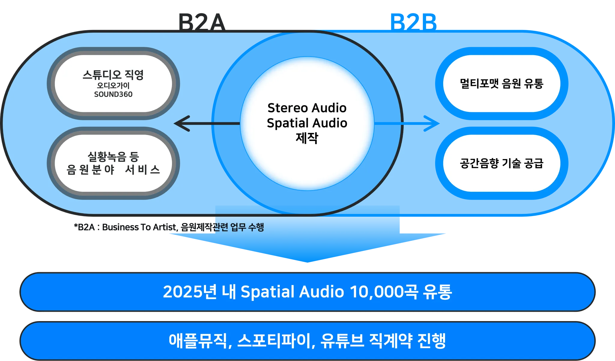 1) 공간음향 음원 자체제작, 외주제작 2) 레코딩 스튜디오 및 음반 레이블 3) 만들어진 멀티포맷 음원을 직접 유통/공급합니다.