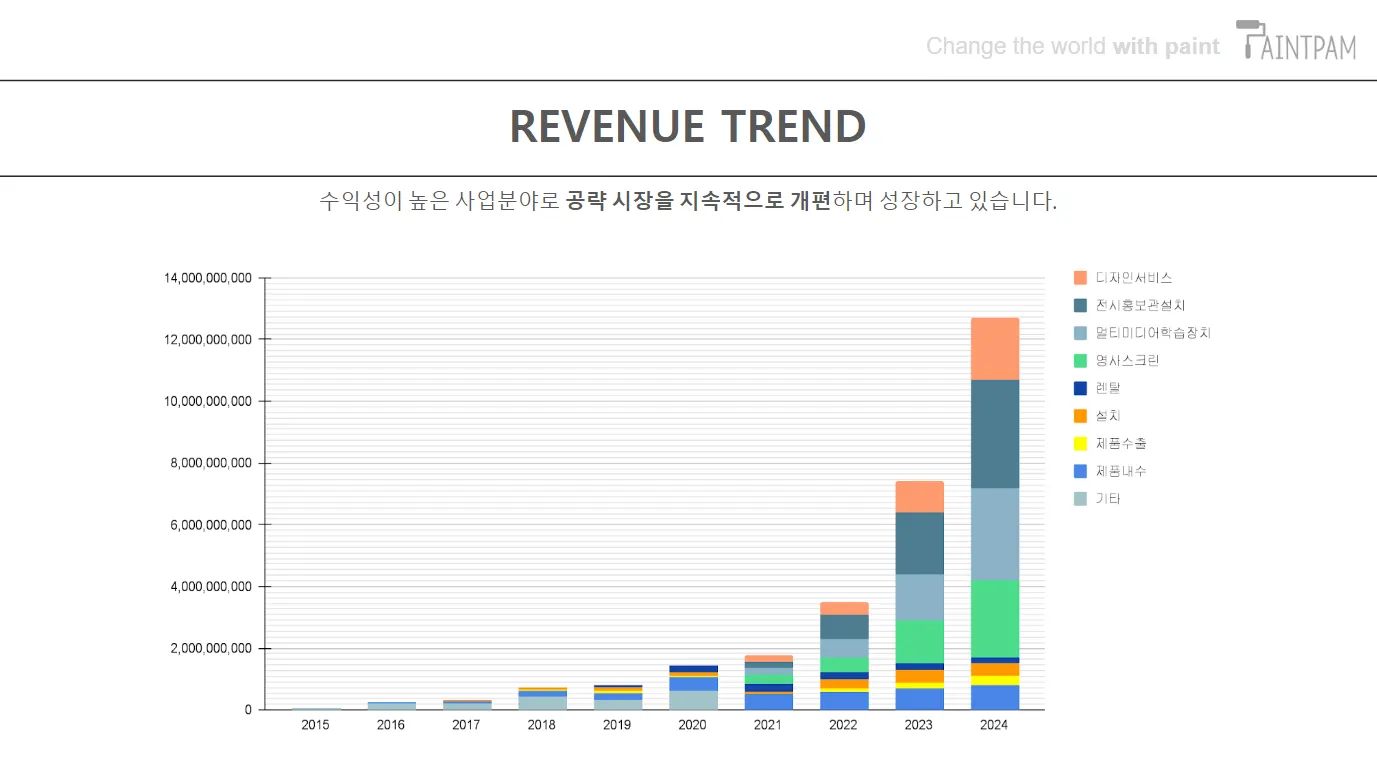 스크린 페인트 제조업으로 시작하여 솔루션을 결합한 디지털사이니지 사업으로 확장하였습니다.